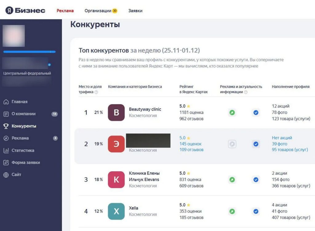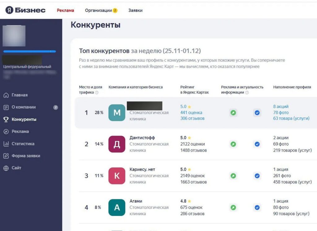 Стоматологическая клиника — анализ конкурентной среды в Яндекс Картах