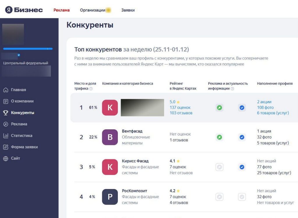 Фасадная компания — 61% трафика в нише в Яндекс Картах