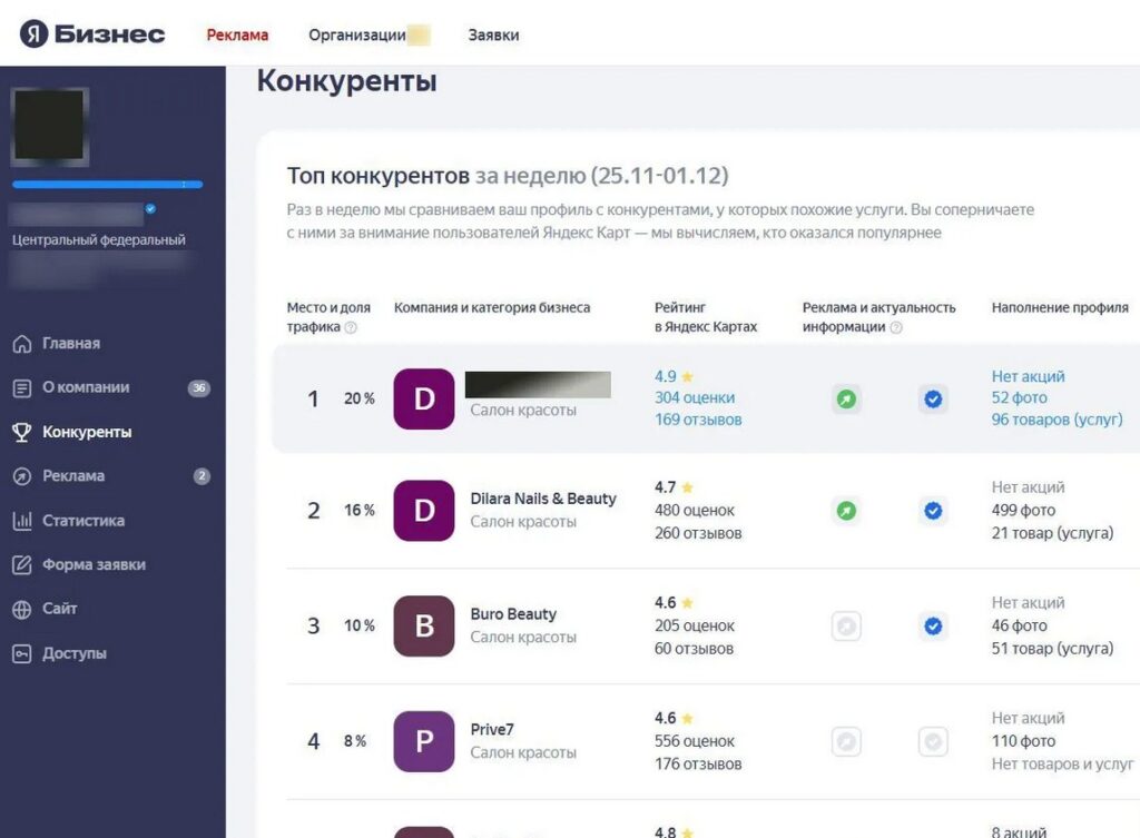 Анализ: неделя 25.11–01.12| Компания | Доля трафика | Оценки / Отзывы | Фото | Услуги | Акции |
